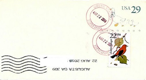 | Hand cancellation: "WRENS STATION, 30833 USPS AUG 22 2018". |