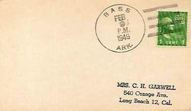 | Hand cancellation on front & back: "BASS, ARK. FEB 9 1949". |