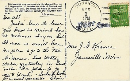 | Hand cancellation: "MONARCH, MONT. AUG 1 1949". |