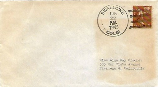 | Hand cancellation: "SWALLOWS, COLO. JUN 22 1943". |