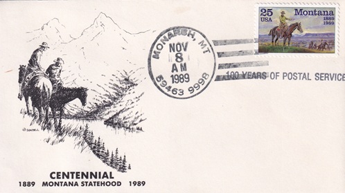 | Special hand pictorial cancellation: "CENTENNIAL STATION, MONARCH, MONTANA 59463 JUL 8 1989". |