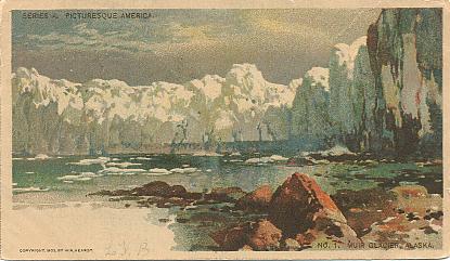 | "Muir Glacier, Alaska". Color printed postcard, UB. Published by Edward H. Mitchell, San Francisco. Number 313. Postmarked 1905, Sitka, Alaska, and Los Angeles, Cal. |