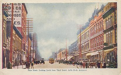 | "Main Street, looking south from Third Street, Little Rock, Arkansas". Color printed postcard, UB. Published by the Van Noy Railroad News Co., Kansas City. Unused. Probably circa 1906. |