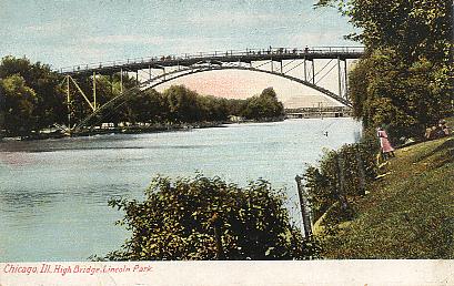| "High Bridge, Lincoln Park, Chicago, Ill.". Color printed postcard, UB. Published by Illustrated Post Card Co., N. Y. Number C-22. Postmarked 1907, Chicago, Ill. |