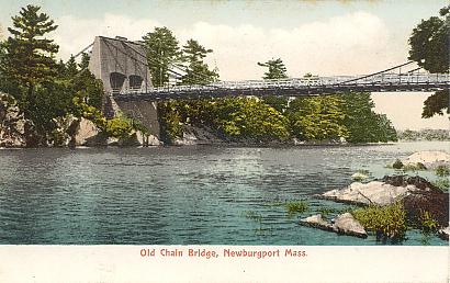 | "Old Chain Bridge, Newburgport, Mass.". Color printed postcard, UB. Published by the New England News Company, Boston, Mass. Printed by A N C, N. Y. Number 5333. Unused. Probably circa 1906. |