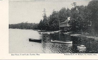 | "Boat House, Crystal Lake, Gardner, Mass.". Black & white printed postcard, UB. Published by E. H. Blodgett, No. Hadley, Mass. Unused. Probably circa 1906. |