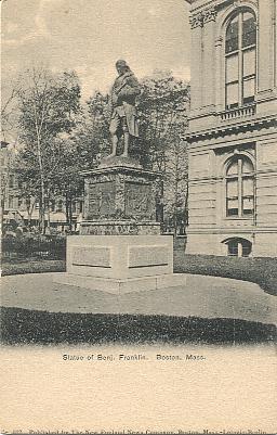 ![]() | "Statue of Benj. Franklin, Boston, Mass.". Black & white printed postcard, UB. Published by the New England News Company, Boston, Mass. Number 32. Unused. Probably circa 1906. |