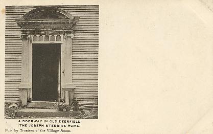 | "A doorway in old Deerfield (the Joseph Stebbins Home)". Black & white printed postcard, UB. Published by Trustees of the Village Room. Unused. Probably circa 1905. |