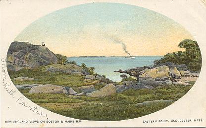 | "New England views on Boston & Maine R.R. Eastern Point, Gloucester, Mass". Color printed postcard, UB. Publisher not given. WONPU. Probably circa 1906. |