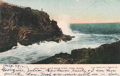 | "Sea wall, Bald Head Cliff, York, Maine". Color printed postcard, UB. Published by G. W. Morris, Portland, Me. Number 534. Postmarked 1905, York Beach, Me., and Connfaut, Ohio. |