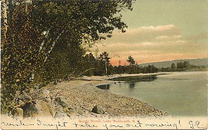 | "Camp ground in 1865, Alton Bay, N. H.". Color printed postcard, UB. Published by W. P. Emerson, Alton Bay, N. H. Number S871729. Unused. Probably circa 1906. |