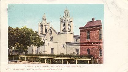 | "Church of San Felipe, Old Town of Albuquerque, N. M.". Color printed postcard, UB. Published by Detroit Photographic Co. Number 6311. Unused. Copyright 1902. |