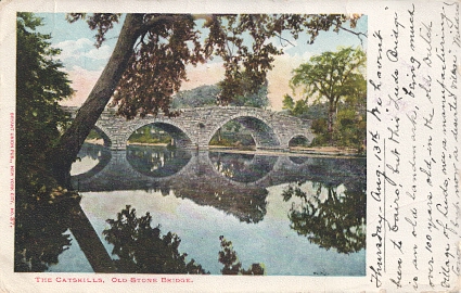 | "The Catskills, Old Stone Bridge". Color printed postcard, UB. Published by Bryant Union Pub., New York City. Number 37. Postmarked 1903, Haines Falls, N.Y., and Philadelphia, PA. |