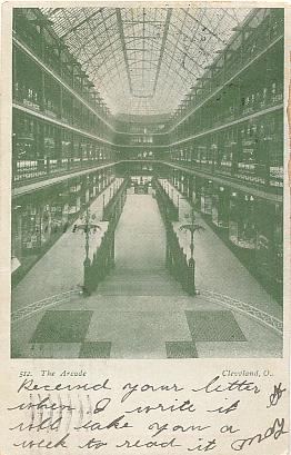 | "The Arcade, Cleveland, O.". Green printed postcard, UB. Published by The Cleveland Post Card Co., Cleveland, O. Number 512. Postmarked 1907, Cleveland, Ohio, and Fort Madison, Iowa. |