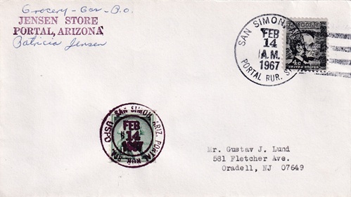 | Two different hand cancellations: "PORTAL RUR. STA., SAN SIMON, ARIZ. FEB 14 1967", and "PORTAL RUR. STA., SAN SIMON, ARIZ. USPO FEB 14 1967". |