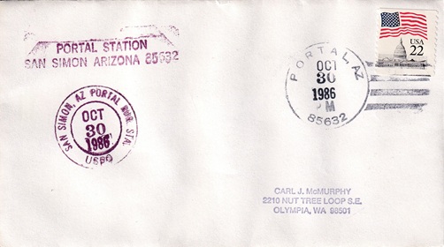 | Two different hand cancellations: "PORTAL, AZ 85632 OCT 30 1986", and "PORTAL RUR. STA., SAN SIMON, ARIZ. USPO OCT 30 1986". |