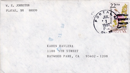 | Hand cancellation: "PORTAL, AZ 85632 JUL 1 1987". |