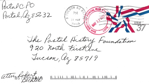 | Hand cancellation: "PORTAL RUR. STA., SAN SIMON, AZ 85632 USPS MAY 16 2001". |