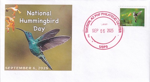 | This cacheted cover features National Hummingbird Day. Hand cancellation: "PHF PHILATELIC CENTER, TUCSON, AZ USPS SEP 6 2025". |