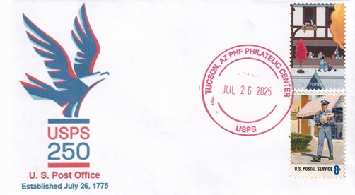 | This cacheted cover commemorates the 250th anniversary of the U. S. Post Office. Hand cancellation: "PHF PHILATELIC CENTER, TUCSON, AZ USPS JUL 26 2025". |