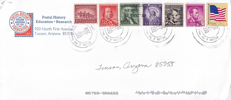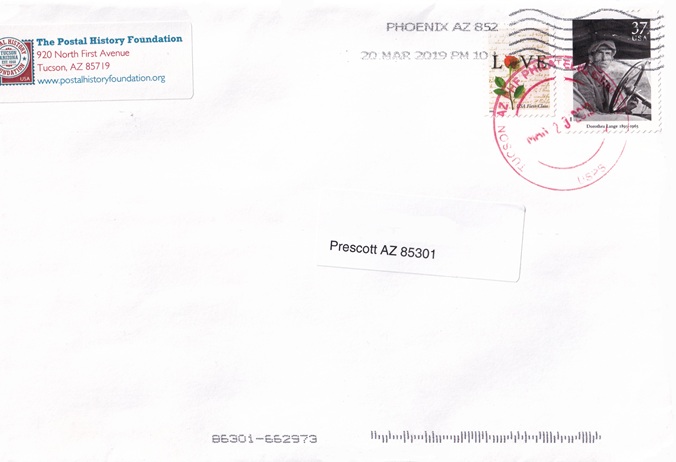 | Hand cancellations: "PHF PHILATELIC CENTER, TUCSON, AZ USPS MAR 19 2019". |