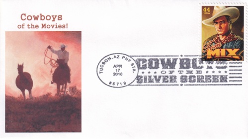 | These four cacheted covers feature cowboys in the movies. Special hand pictorial & slogan cancellations: "PHF STA., TUCSON, AZ 85719 APR 17 2010 | COWBOYS OF THE SILVER SCREEN |". [TPS] |