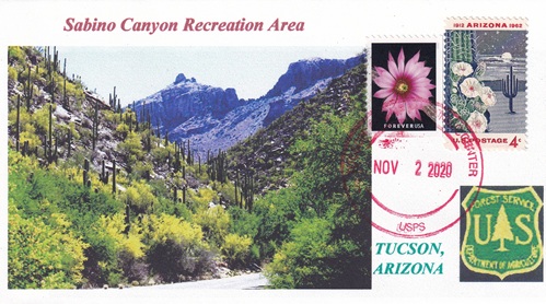 | This cacheted cover promotes the Sabino Canyon Recreation Area (USFS). Hand cancellation: "PHF PHILATELIC CENTER, TUCSON, AZ USPS NOV 2 2020". |