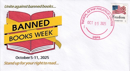 | This cacheted cover celebrates Banned Books Week. Hand cancellation: "PHF PHILATELIC CENTER, TUCSON, AZ USPS OCT 5 2025". |