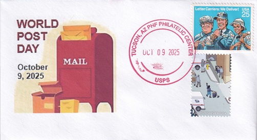 | This cacheted cover features World Post Day. Hand cancellation: "PHF PHILATELIC CENTER, TUCSON, AZ USPS OCT 9 2025". |