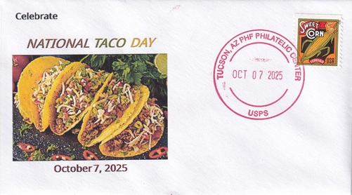 | This cacheted cover is for National Taco Day - YUM! Hand cancellation: "PHF PHILATELIC CENTER, TUCSON, AZ USPS OCT 7 2025". |