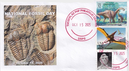 | This cacheted cover announces National Fossil Day. Hand cancellation: "PHF PHILATELIC CENTER, TUCSON, AZ USPS OCT 15 2025". |