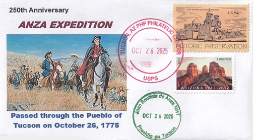 | This cacheted cover commemorates the 250th anniversary of the Anza Expedition passing through Tucson, AZ. Hand cancellation: "PHF PHILATELIC CENTER, TUCSON, AZ USPS OCT 26 2025". |