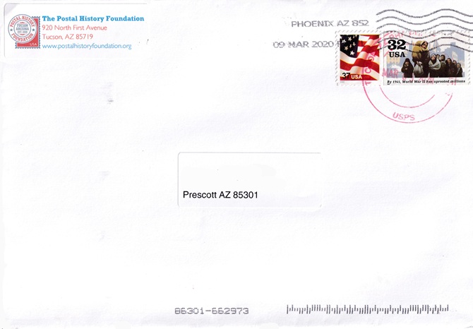 | Hand cancellation: "PHF PHILATELIC CENTER, TUCSON, AZ USPS MAR 9 2020". |