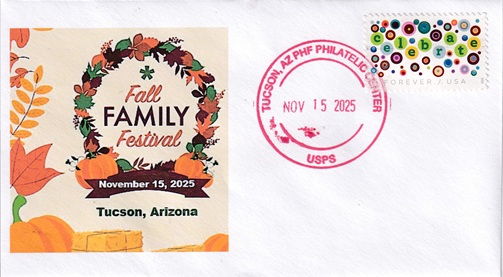 | This cacheted cover features the Fall Family Festival in Tucson. Hand cancellation: "PHF PHILATELIC CENTER, TUCSON, AZ USPS NOV 15 2025". |