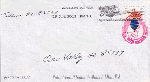 | Hand cancellation: "PHF PHILATELIC CENTER, TUCSON, AZ USPS JUL 25 2012". |