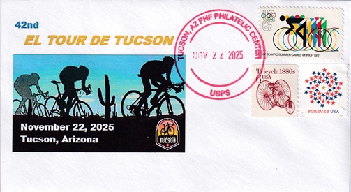 | This cacheted cover promotes the El Tour de Tucson bicycle ride in Tucson. Hand cancellation: "PHF PHILATELIC CENTER, TUCSON, AZ USPS NOV 22 2025". |