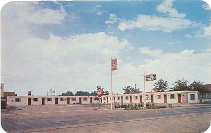 | "66 Motel. Holbrook, Arizona, 2 miles east of center of town". Color chrome-style printed postcard. Published by Petley Studios, Phoenix, Arizona. Number 74280. Postmarked 1965. |