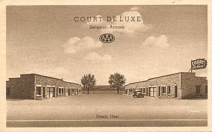 | "Court de Luxe. ..on U. S. Highway No. 66 at Seligman, Arizona. ...". Sepia color printed postcard. Published by Asco, Oakland, Calif. Unused. Circa late 1930s. |