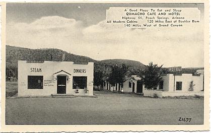 | "Qumacho Cafe and Motel. Highway 66, Peach Springs, Arizona. ...". Black & white chrome-style printed postcard. Published by Kaeser & Blair, Cincinnati, Ohio. Number 21677. Unused. Circa 1940s. |