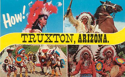 | "How! Truxton, Arizona". Color chrome-style printed postcard. Published by Dexter Press, West Nyack, N. Y. Number DR-99077-B. Unused. Circa 1960s. |