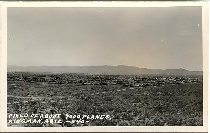 | "Field of about 7000 planes. Kingman, Ariz.". Real photo postcard. Publisher not given. Number 540. Unused. Circa 1940s. |