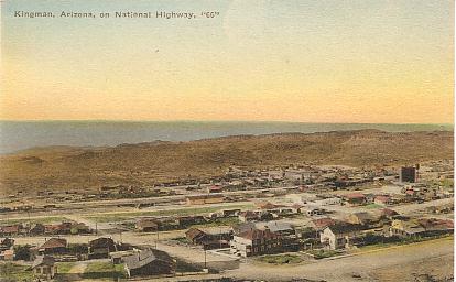 | "Aerial view, Kingman, Arizona". Real photo postcard. Publisher not given. Unused. Circa 1940s. [U. S. 66 runs from the upper right center to the bridge near the lower right corner]. |