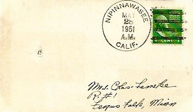 | Hand cancellation: "NIPINNAWASSE, CALIF. MAY 28 1951". |