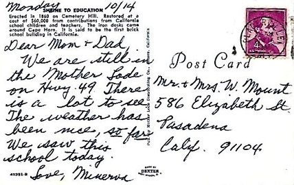 The postmarks in this exhibit are on postally used envelopes and postcards and date from 1934, the year the route was created and signed, to the present. They are listed in travel order along California Highway 49 from its south terminus to its north end.