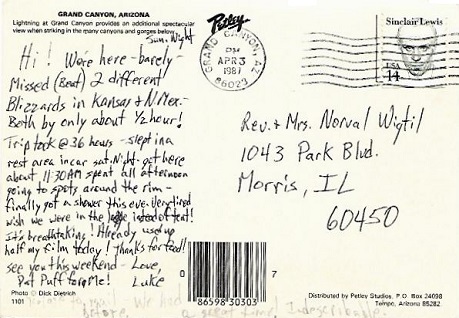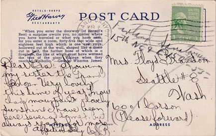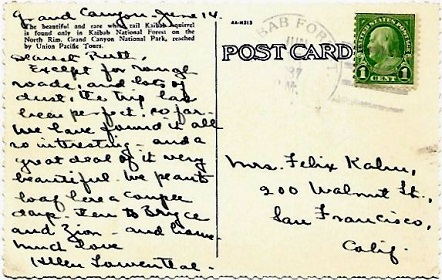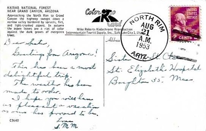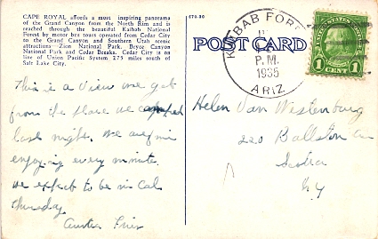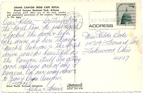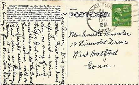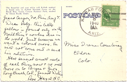 Hand cancellation: "NORTH RIM, ARIZ. JUN 7 1948". [This was sent by my aunt to my grandparents!]