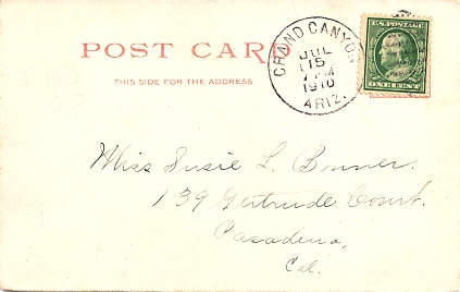 Hand cancellation: "GRAND CANYON, ARIZ. JUL 6 1915".