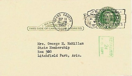 Hand cancellation: "NORTH RIM RUR. STA., FREDONIA, ARIZ. AUG 16 1957".