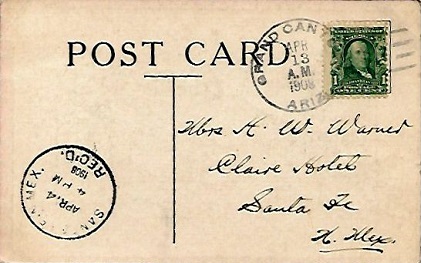Doane hand cancellation: "GRAND CANYON, ARIZ. APR 13 1908 | 11 |". [TPC]