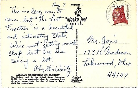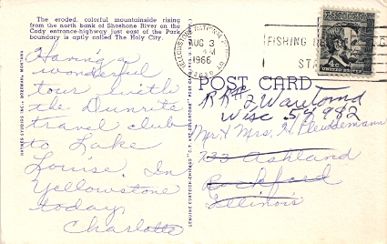 | Machine cancellation: "| FISHING BRIDGE STA. | YELLOWSTONE NATIONAL PARK, WYO. AUG 15 1963". |