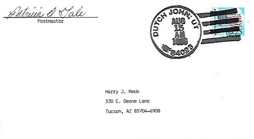 | Hand cancellation: "ZION NATIONAL PARK RUR. STA., SPRINGDALE, UTAH AUG 15 1958". |